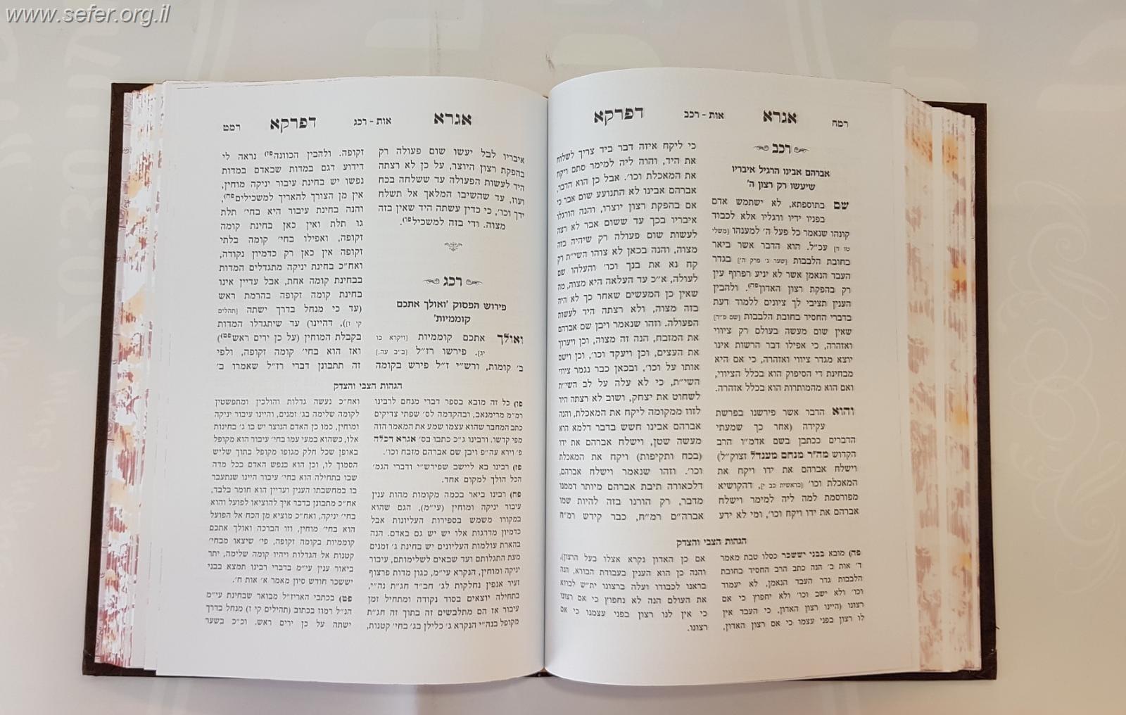 אגרא דפרקא / ר' צבי אלימלך מדינוב. חזר למלאי 15/3/19. הספר 'אגרא דפרקא' מכיל אוצר מאמרי מוסר וחסידות. דברים עתיקים ושיחות נאות מדבש מתוקים ונופת צופים, אשר יצאו מפה קדוש כבוד קדושת האדמו"ר הרה"ק סיני ועוקר הרים מרן ר' צבי אלימלך שפירא אבד"ק דינוב. נערך ונדפס מחדש מבואר ומתוקן ע"פ כתב יד עם הגהות הצבי והצדק בתוספת מפתחות מפורטים. על רבי אלימלך מדינוב: רבי צבי אלימלך שפירא מדינוב היה אדמו"ר חסידי בדור החמישי לתנועת החסידות. מכונה על פי רוב, בשם חיבורו המפורסם "בני יששכר". מתלמידי החוזה מלובלין ורבי מנחם מנדל מרימנוב, ואחריהם המגיד רבי ישראל הופשטיין מקוז'ניץ ורבי אברהם יהושע השל מאפטא (מחבר ה"אוהב ישראל"). קשרים קרובים היו לו עם תלמידי בית-מדרשו של החוזה מלובלין ובראשם רבי נפתלי צבי מרופשיץ ורבי צבי הירש מזידיטשוב. שימש ברבנותן של דינוב (שם היה מרכז חצרו) רוביטש, סטריז'וב, האליטש (הלישוי), ומונקאץ שאז הייתה חלק מהונגריה. פעל רבות להפצת תורת הקבלה ונלחם בחריפות נגד המשכילים. בזמן כהונתו במונקאץ אסר על פיטום אווזים משום צער בעלי חיים, ולכן עורר עליו את חמתם של פרנסי העיר ונאלץ לעזוב את מונקאץ ולחזור לדינוב. נהג לחתום על מכתביו בחתימה "האוהב הנאמן לכל ישראל, דורש טוב לעמו". נפטר בדינוב בי"ח בטבת תר"א (11 בינואר 1841) בגיל 58, והשאיר שלשה בנים ושלוש בנות. בנו רבי דוד (1804 - 1874), מילא את מקומו כאדמו"ר בדינוב. ה"בני יששכר" הוא אחד החיבורים שקנו אחיזה בקרב כל חוגי החסידים ונמנה עם הקלאסיקה החסידית, ומכאן חשיבותו של ר' צבי אלימלך. חידש הרבה סגולות והידועה ביניהן היא סגולת הזיווג על ידי אמירת מזמור קכ"א בתהילים (שיר למעלות אשא עיני אל ההרים), שאותו יש להגיד 4 פעמים ביום. וכן חידש את המנהג לפזר עשבים ופרחים על רצפת בית הכנסת בשבועות היות ש: "ישראל משולה כשושנה של ורד והעולם כפרדס. המלך רצה להשמיד את הפרדס, אלא שראה השושנה ובזכותה מציל את הפרדס. כך ישראל שקבלה את התורה נמשלה כשושנה ומצלת את הפרדס" (הפרדס = העולם). עודד את העיסוק בספר הזוהר וכתב: "הנה ביום הזה אשר נכתב הספר הקדוש הזוהר שהוא מהארת האור כי טוב הגנוז... וזה מאיר לנו בגלות עד יתגלה בזכות זה משיח צדקנו יהי אור זה אורו של מלך המשיח". (בני יששכר, מאמרי חדש אייר מאמר ג' אות ד') "אמת שמקובל בידינו שגם מי שלא ידע כלום אף על פי כן לשון הזוהר מסוגל לזכך הנפש". (הוספות מהרצ”א, אות ט') "ושבתם וראיתם בין צדיק וכו' בין עובד אלהים לאשר לא עבדו, עובד אלהים היינו העוסק בתלמוד ובזוהר. לא עבדו העוסק בתלמוד לבד ואינו עוסק בזוהר". (מעין גנים, פרק א' אות ב')