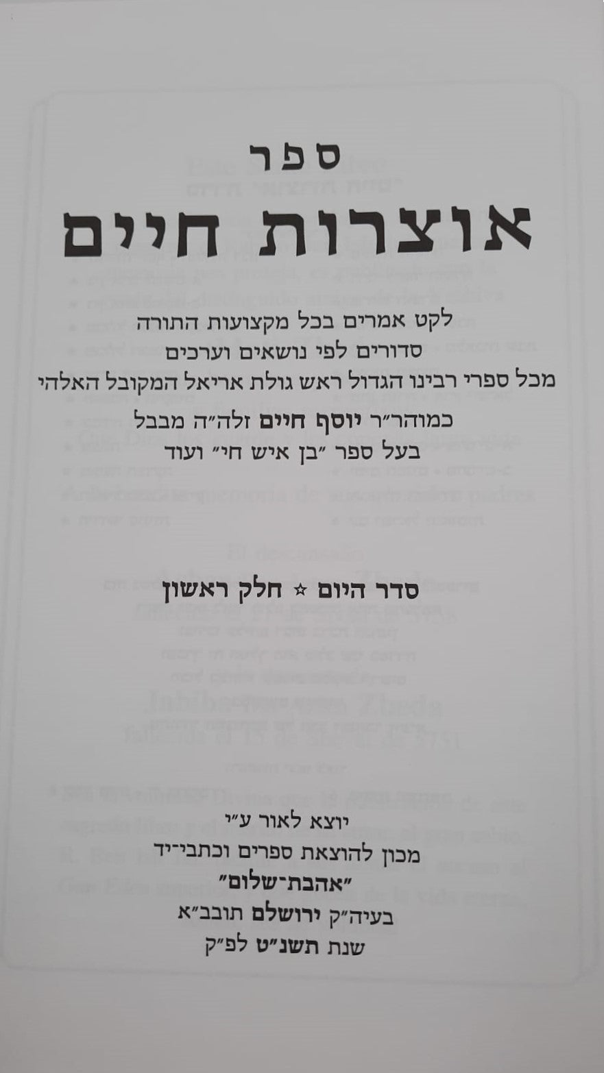 לגבי אוצרות חיים ה' כרכים / לקט אמרים ממשנת רבינו הבן איש חי זצוק"ל
