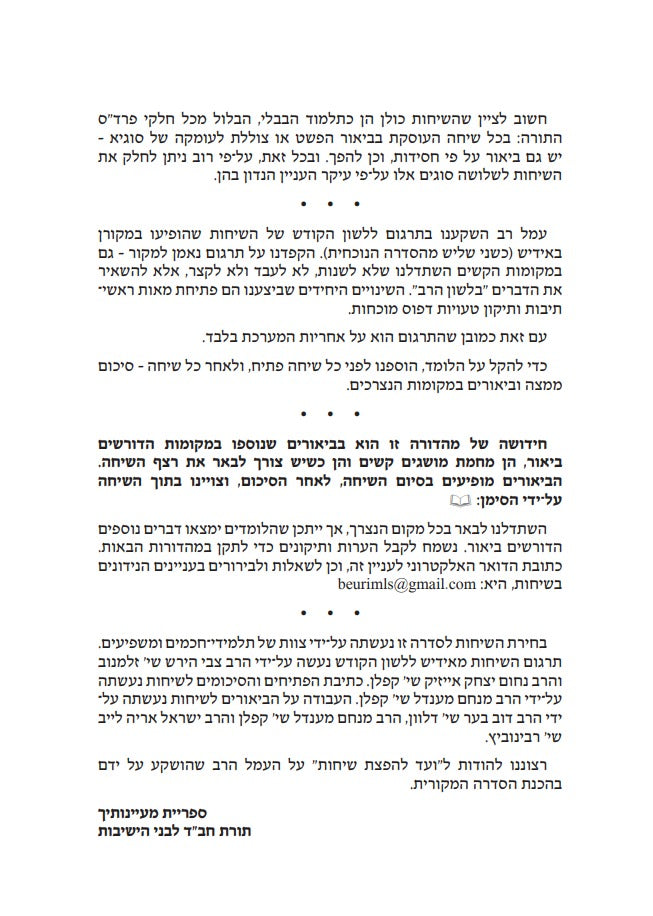 שש שיחות נבחרות של הרבי מליובאוויטש לכל אחת מפרשיות השבוע ומועדי השנה מתורגמות ללשון הקודש, בתוספת סיכומים.
