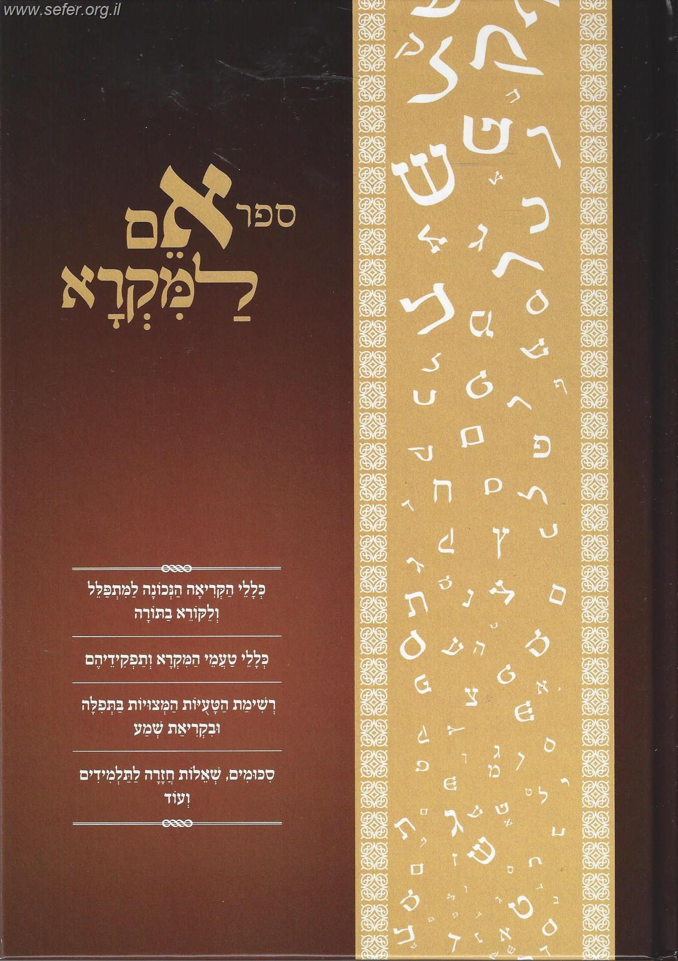 אם למקרא - כללי הקריאה וטעמי המקרא. הספר 'אם למקרא' מכיל את כללי הקריאה הנכונה למתפלל ולקורא בתורה. כללי טעמי המקרא ותפקידיהם, רשימת הטעויות המצויות בתפילה ובקריאת שמע, סיכומים, שאלות חזרה לתלמידים ועוד.