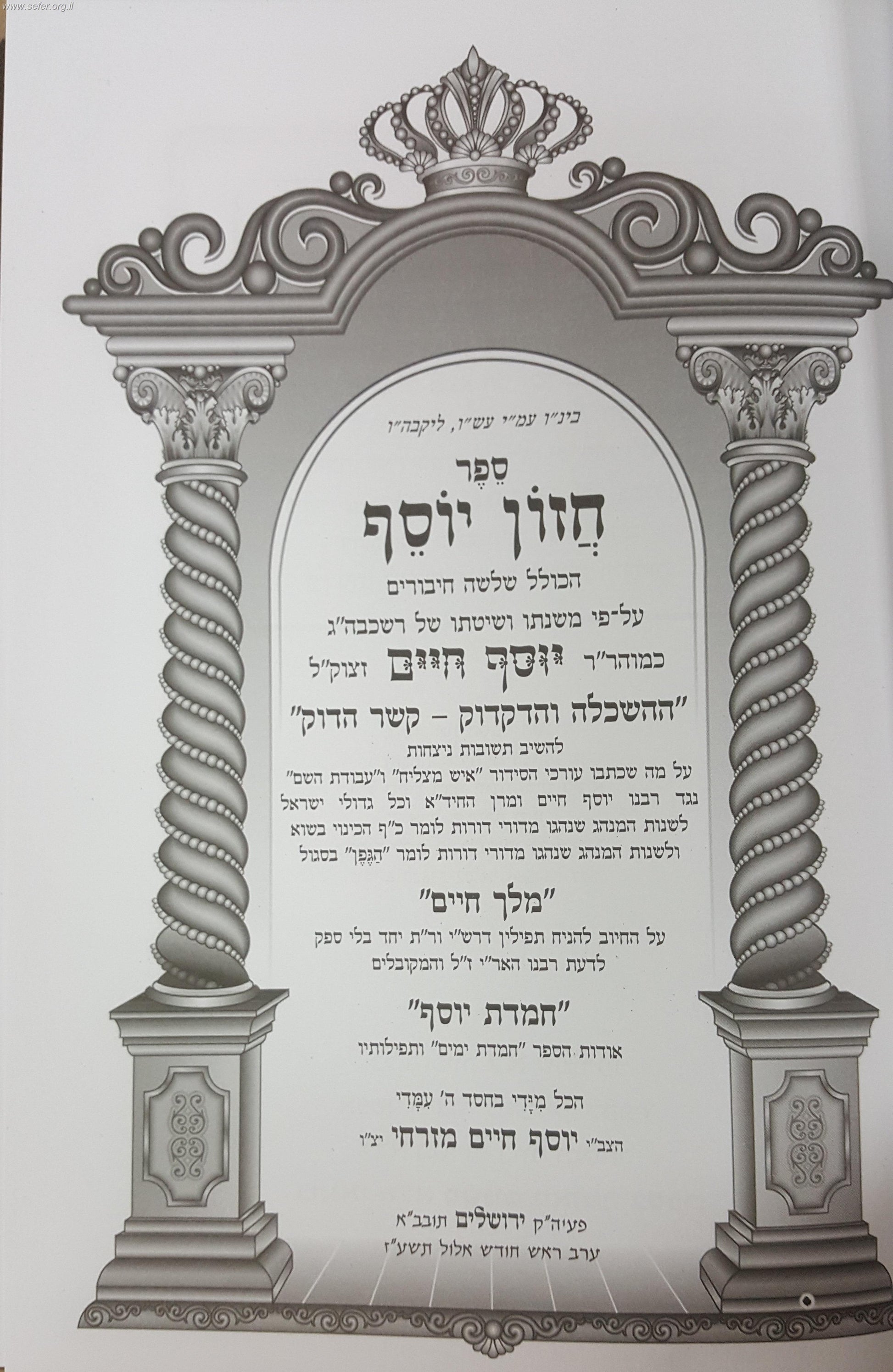 חזון יוסף / יוסף חיים מזרחי. ספר 'חזון יוסף' הכולל שלושה חיבורים על פי משנתו ושיטתו של רשכבה"ג רבינו יוסף חיים זצוק"ל בעל הבן איש חי. ההשכלה והדקדוק – קשר הדוק – להשיב תשובות ניצחות על מה שכתבו עורכי הסידור 'איש מצליח' ועבודת השם, נגד רבינו יוסף חיים ומרן החיד"א וכל גדולי ישראל, לשנות את המנהג שנהגו מדורי דורות לומר כ"ף הכינוי בשווא ולשנות המנהג שנהגו לומרמדורי דורות 'הגפן' בסגול. מלך חיים – על החיוב להניח תפילין דרש"י ור"ת יחד בלי ספק לדעת רבינו האר"י ז"ל והמקובלים. חמדת יוסף – אודות הספר חמדת ימים ותפילותיו. נערך ונכתב ע"י ר' יוסף חיים מזרחי. אלול תשע"ז.