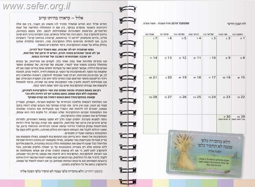 יומן שבועי לשנת תש"פ בכריכת ספירלה.