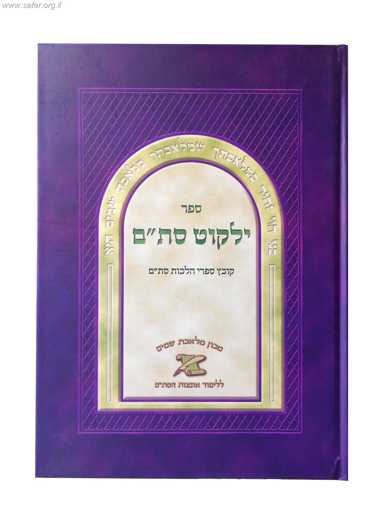 ילקוט סת"ם - קובץ ספרי הלכות סת"ם. חזר למלאי 15/4/18. הוצאה חדשה בכריכה חדשה. במהדורה זו השמיטו את דברי המ"ב. הספר ילקוט סת"ם הינו קובץ ספרי הלכות סת"ם, בהוצאת מכון מלאכת שמים - מכון ידוע ללימוד אומנות הסת"ם. 420 עמ'.