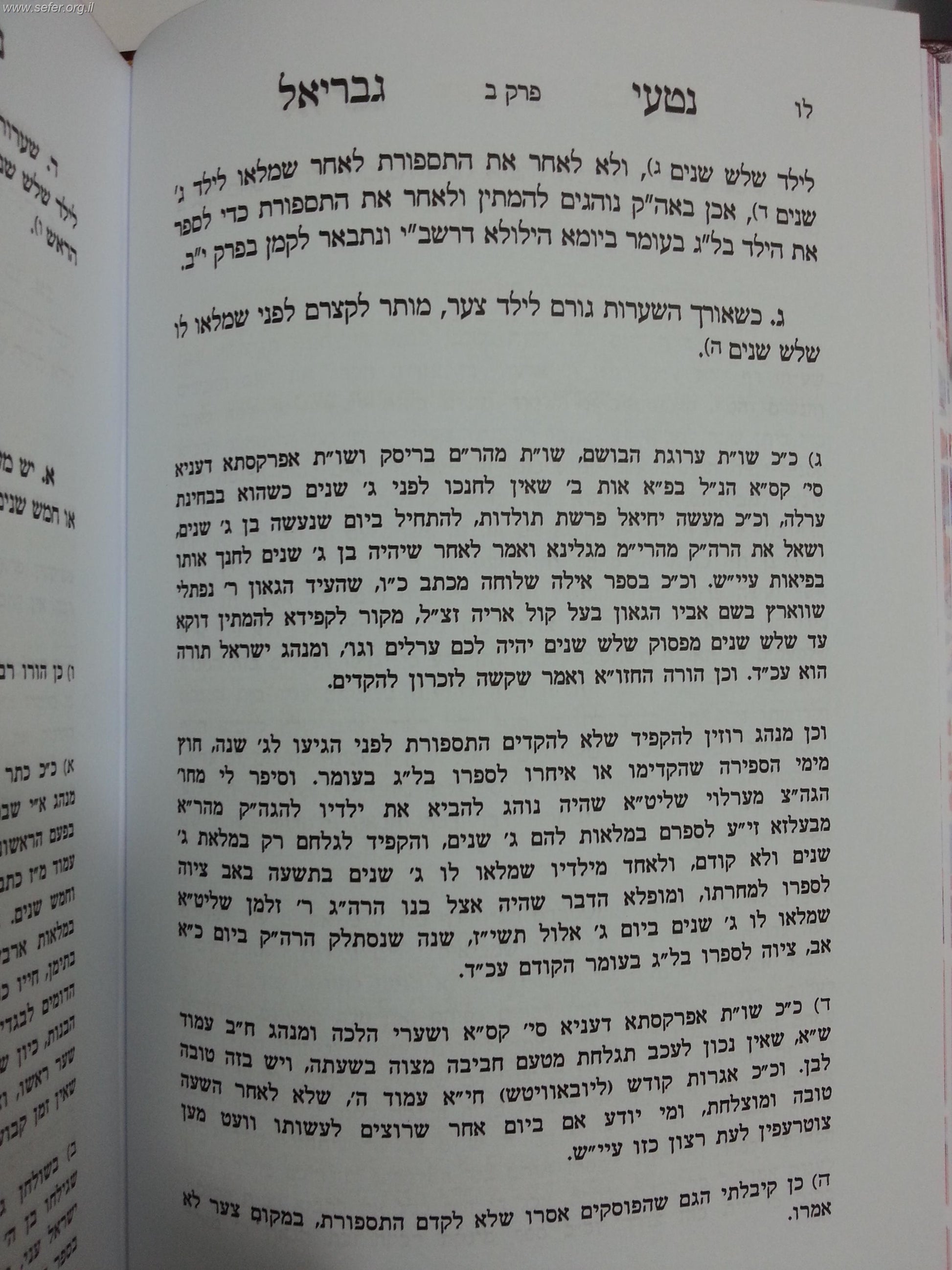 הספר מכיל הלכות ומנהגי חינוך הילדים מעריסתם, תגלחת הבנים שני שלוש –