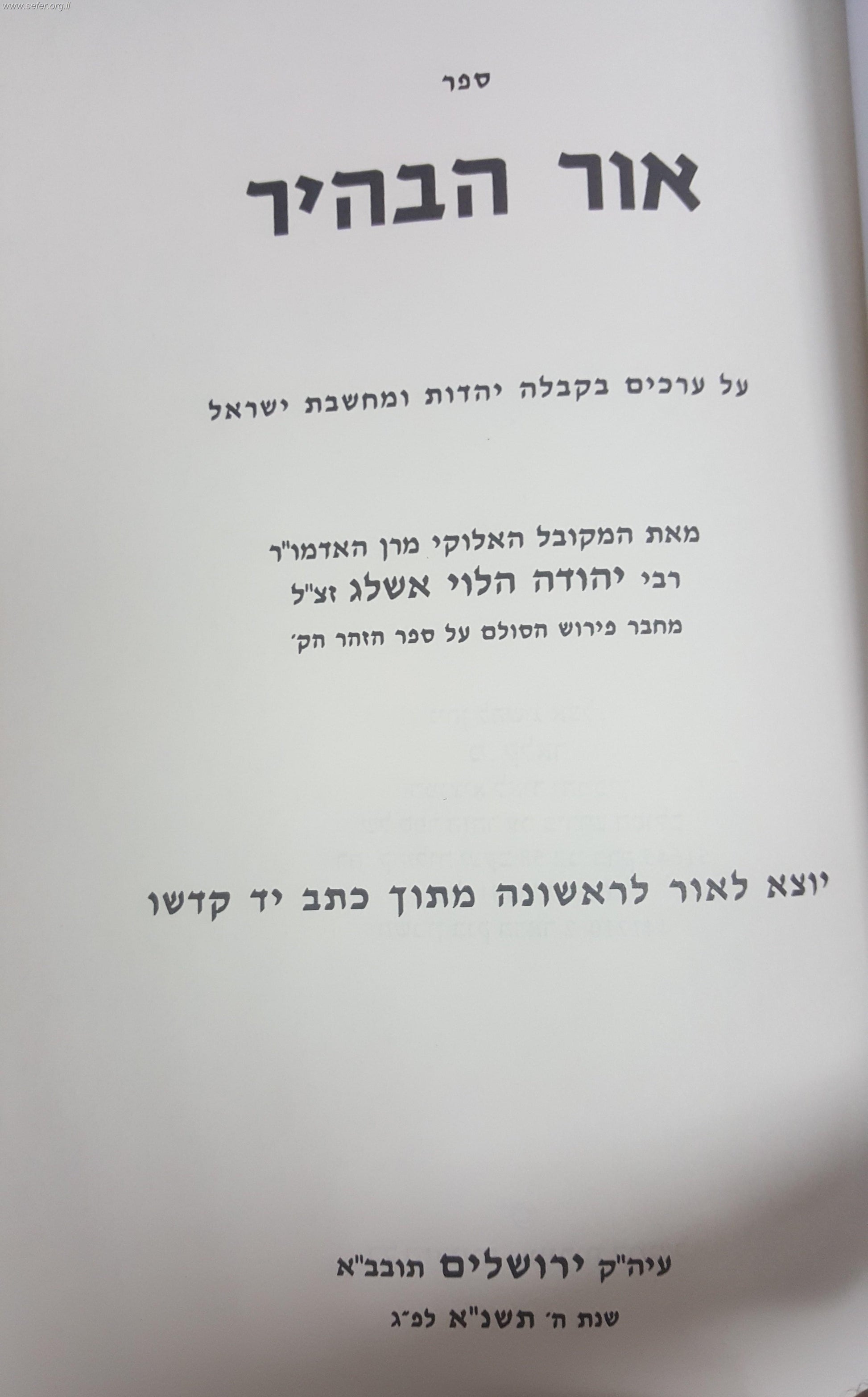 ספר אור הבהיר - מילון למושגי חכמת הקבלה יהדות, ומחשבת ישראל / בעל הסולם.
