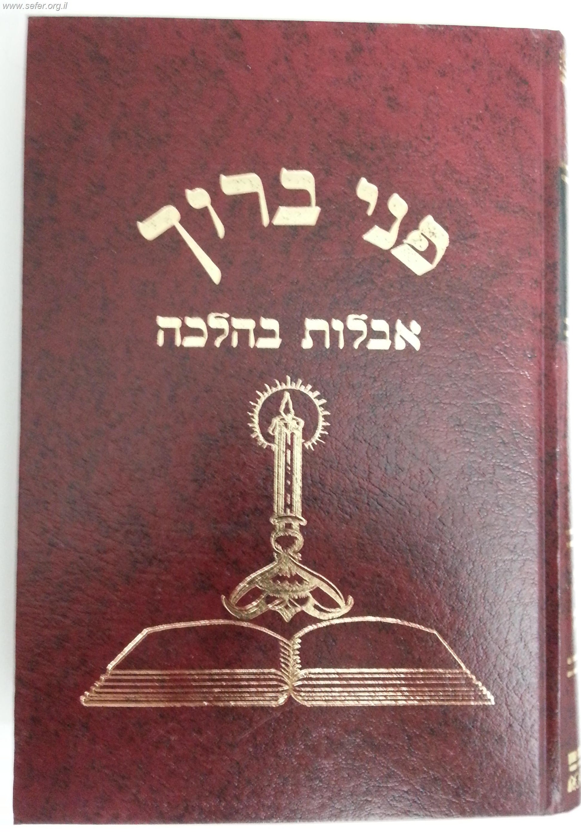 פני ברוך - אבלות בהלכה. קיים במלאי. הספר 'פני ברוך – אבלות בהלכה' הינו אוצר דינים ומנהגים הנהוגים במשך שנת האבלות כולל: דיני אמירת קדיש, הזכרת נשמות, השטחות על קברים וכל דיני ומנהגי יום היארצייט ערוכים ומסודרים בסדר טוב ומועיל בלשון קלה עם ציוני מקורות והערות בפני החיים חובר ע"י הרב חיים בנימין גולדברג. בסוף הספר נדפס קונטרס אהל חנה המכיל תשובות ובירורים בענייני הספר.