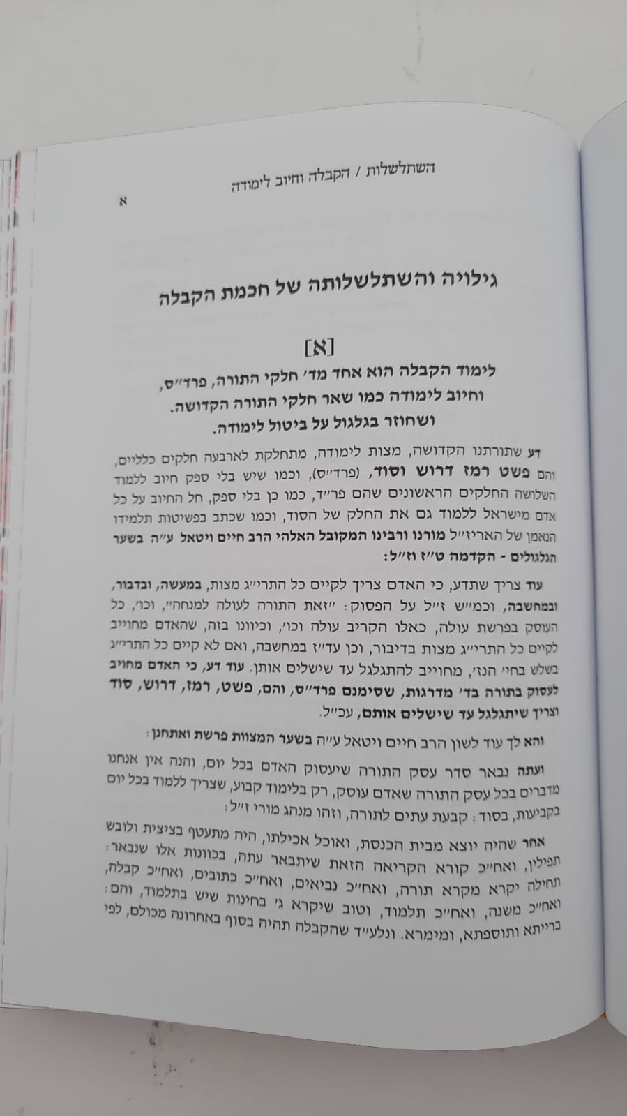א • השתלשלות הקבלה - מבאר עניין גילוי השתשלות הקבלה וחיוב לימודה כולל תיאור האישים וספריהם