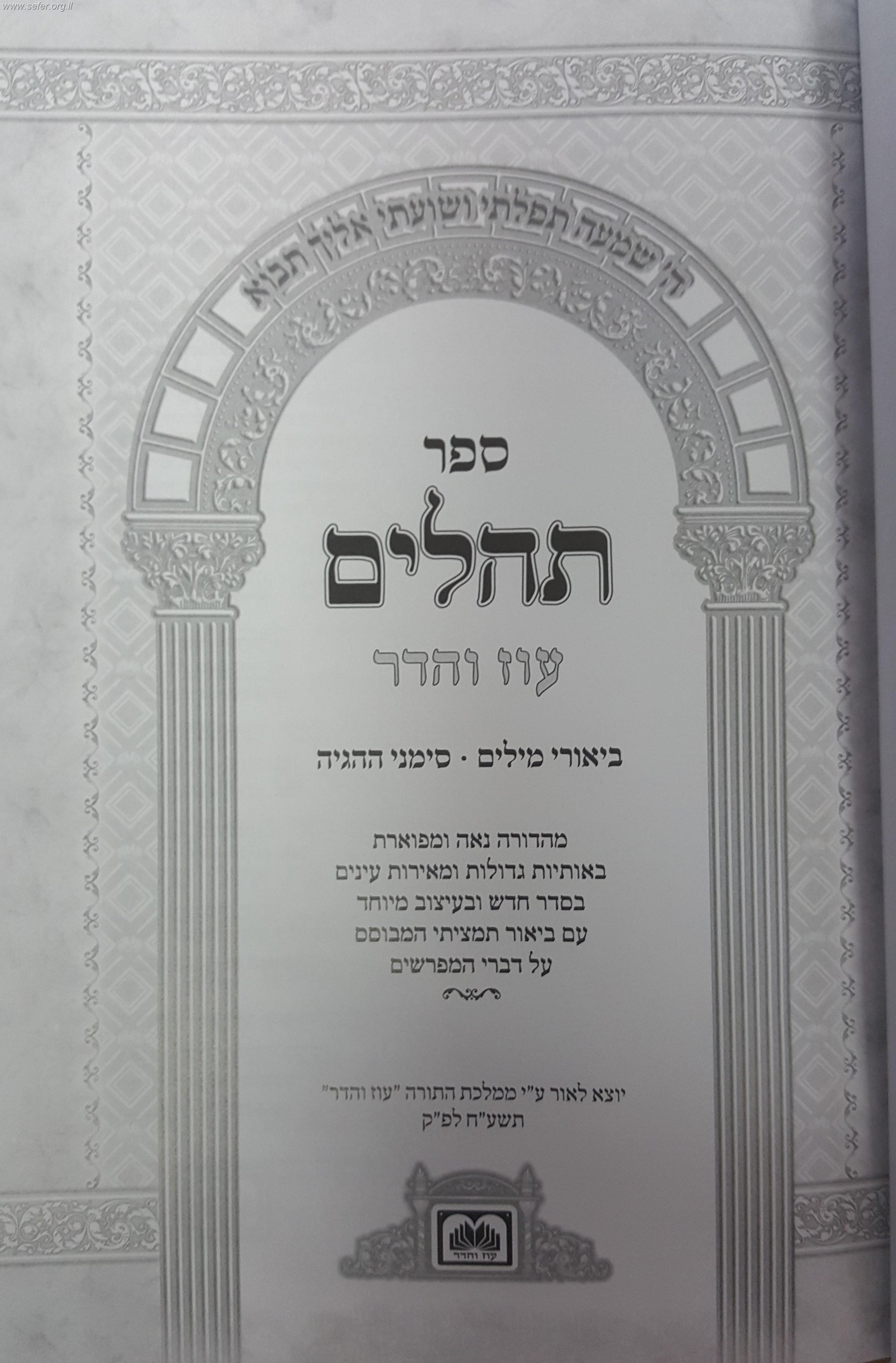 תהילים עם ביאורי המילים / עוז והדר. ספר תהילים 'עוז והדר' עם ביאורי המילים וסימני ההגיה. מהדורה נאה ומפוארת באותיות גדולות ומאירות עיניים בסדר חדש ובעיצוב מיוחד, עם ביאור תמציתי המבוסס על דברי המפרשים.
