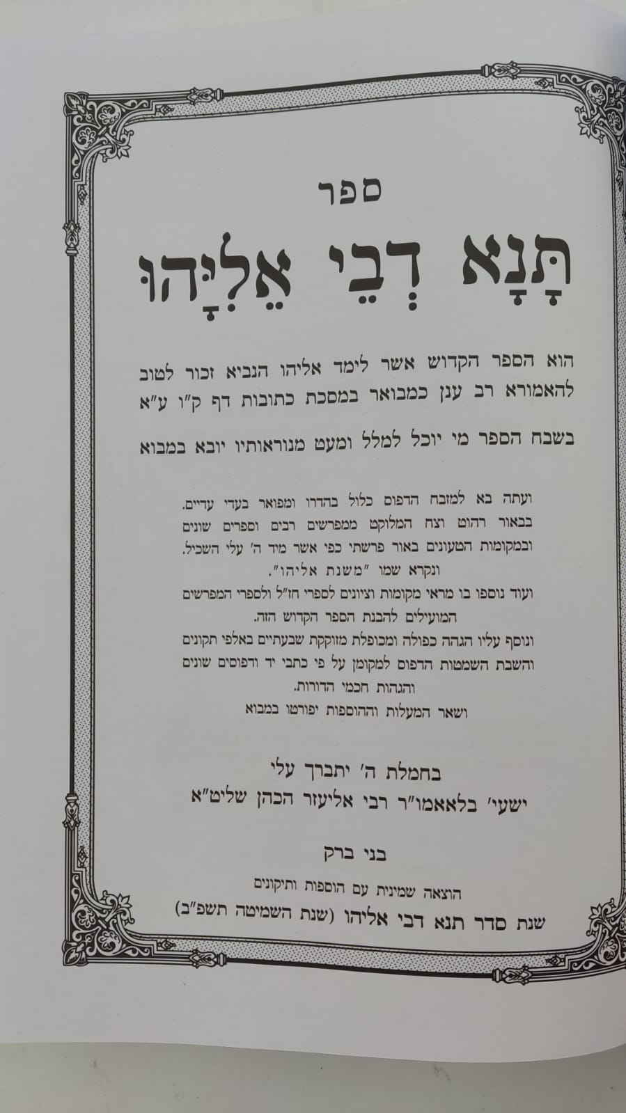 הספר תנא דבי אליהו מנוקד ומוגה וערוך ומסודר מחדש, עם פירוש וביאור רהוט וצח המלוקט ממפרשים רבים וספרים שונים אשר נקרא "משנת אליהו".כמו כן במהדורה זו נוספו מראי מקומות וציונים לספרי חז"ל ולספרי המפרשים המועילים להבנת הספר. תנא דבי אליהו הוא הספר אשר לימד אליהו הנביא זכור לטוב להאמורא רב ענן.